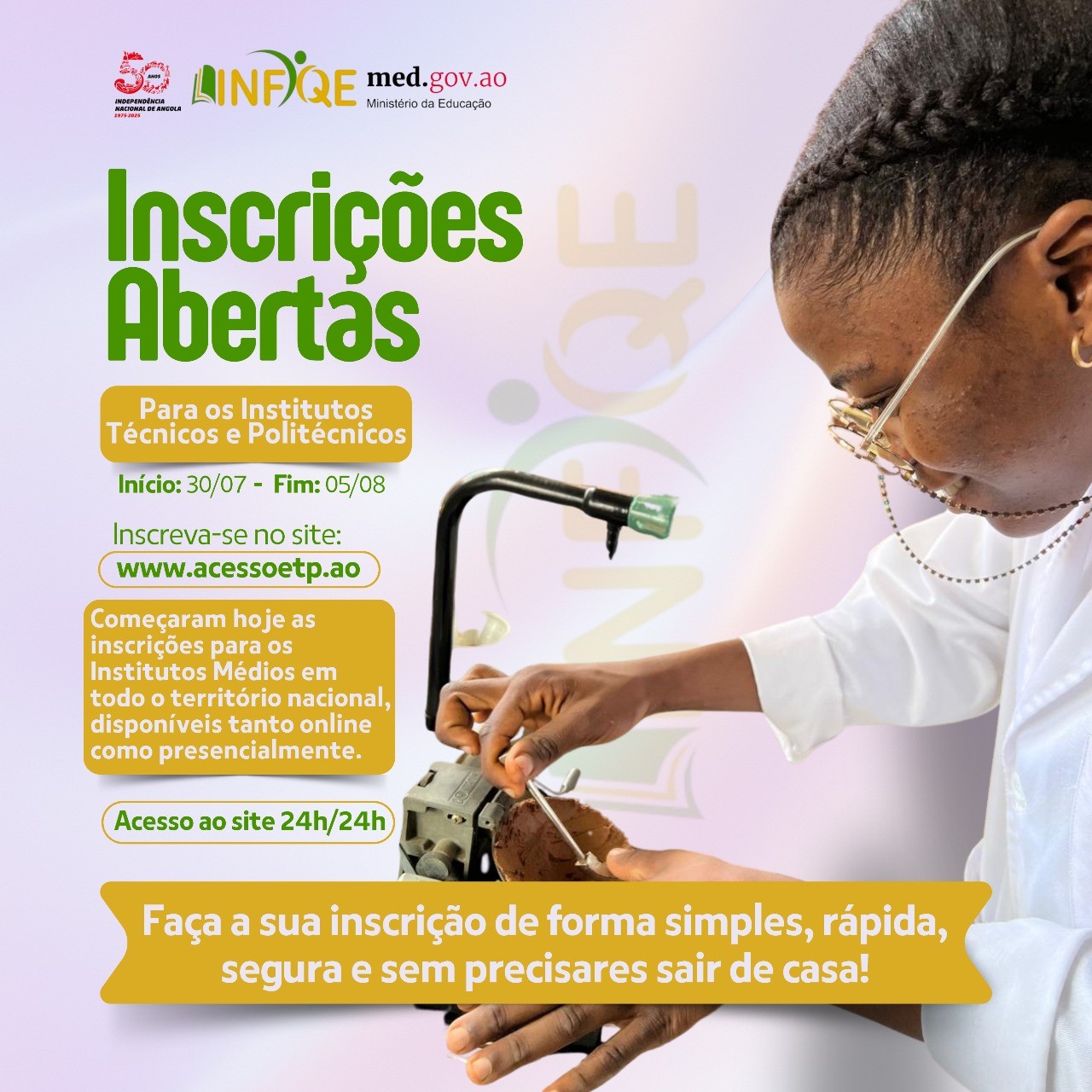 Informamos ao público em geral que tiveram início, nesta data30.07.2025, as inscrições via online para os Institutos Técnicos e Politécnicos em todo o território nacional.